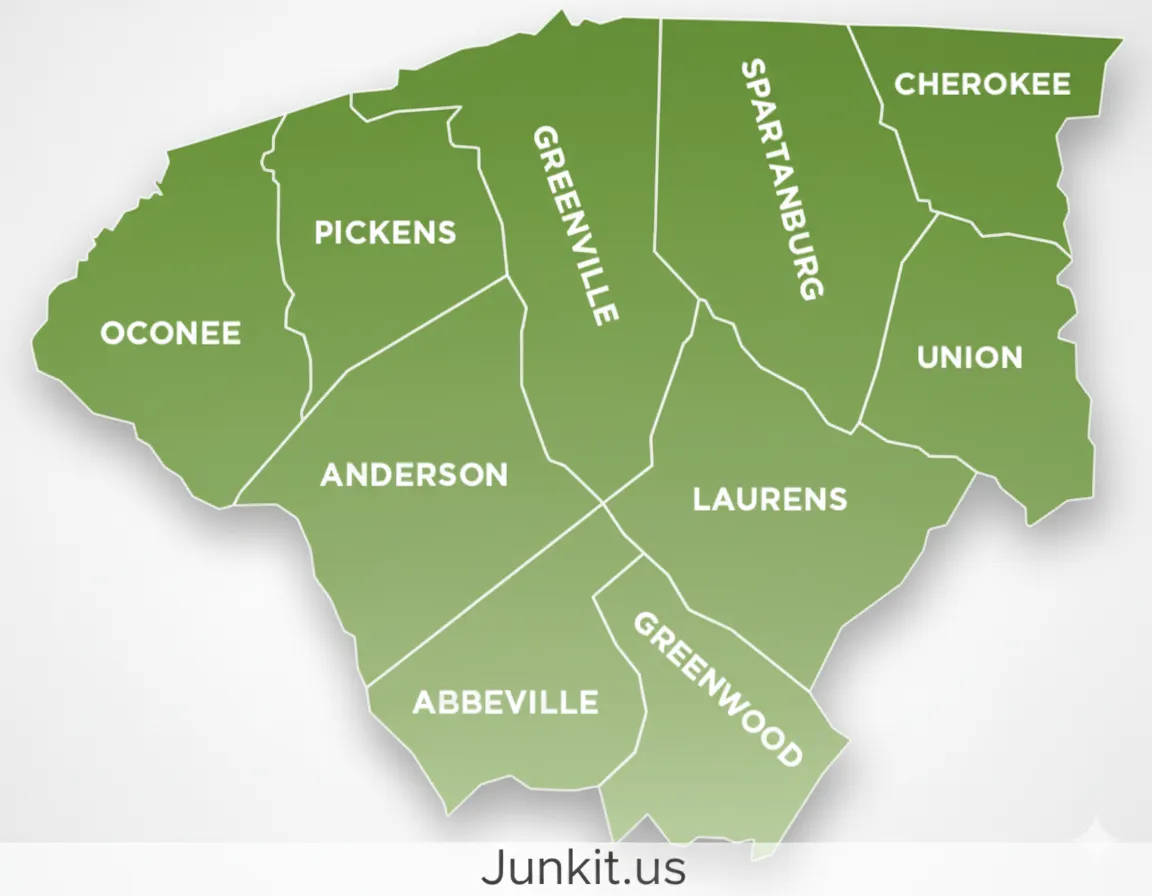 Junkit.us is a family owned business serving the beautiful Upstate, SC area. Now we offer junk removal service to the entire Upstate! Local cities within the Upstate include Easley, Greenville, Powdersville, Simpsonville, Piedmont, Taylors, Roebuck, Duncan, Pelzer, etc. Anderson County, Abbeville, Cherokee, Greenwood, Greenville County, Laurens, Oconee, Pickens County, Spartanburg County, and Union Counties. We pride ourselves in over delivering and providing a professional service while minimizing the impact on local landfills by reusing, recycling and repurposing as much as possible. You can rest assured that we will dispose of your junk responsibly.